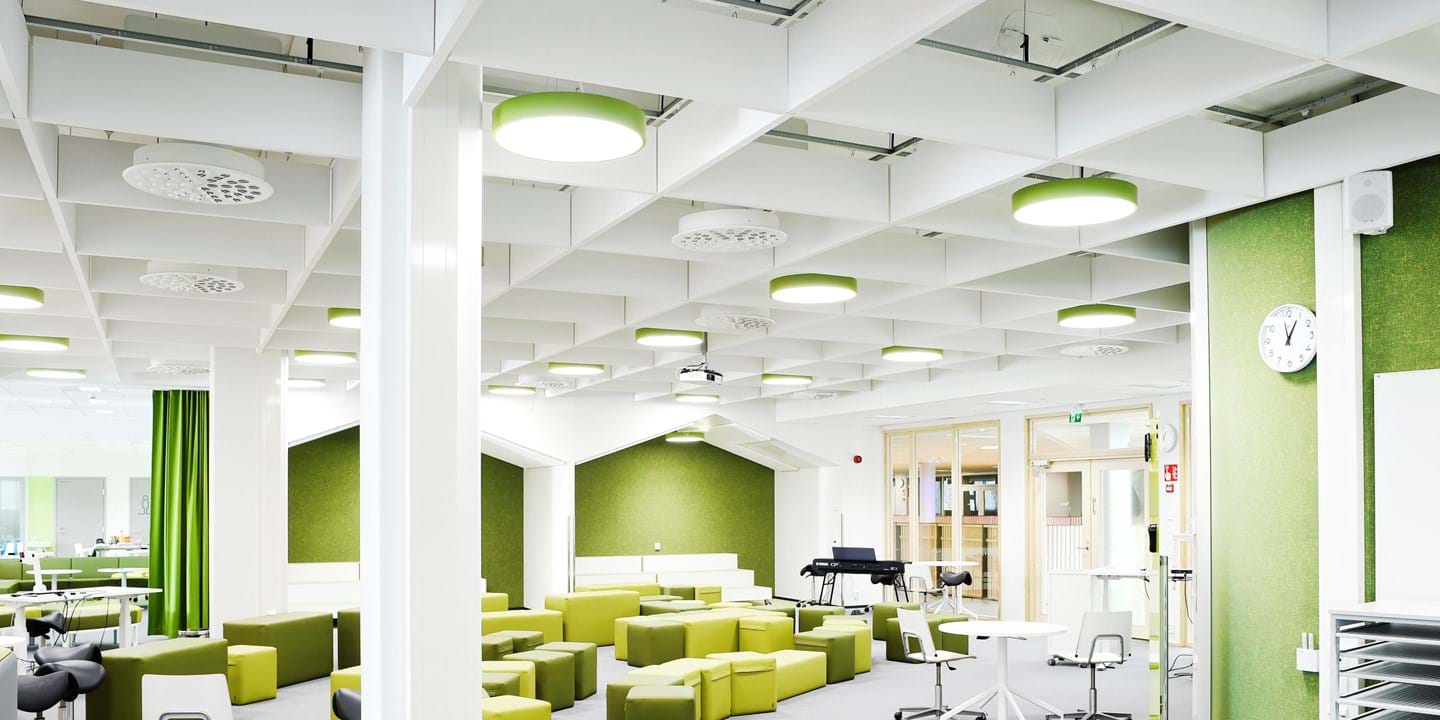 Textilní koberec byl vybrán jako podlahový materiál pro většinu otevřených učebních prostředí. Textilní koberec pokrývá i část příček. Na strop byly použity akusticky navržený Focus E a nápadné Solo Baffles, zatímco na stěnách byla použita řešení Akusto Wall, která zajistila připojovacím povrchům akustické vlastnosti.