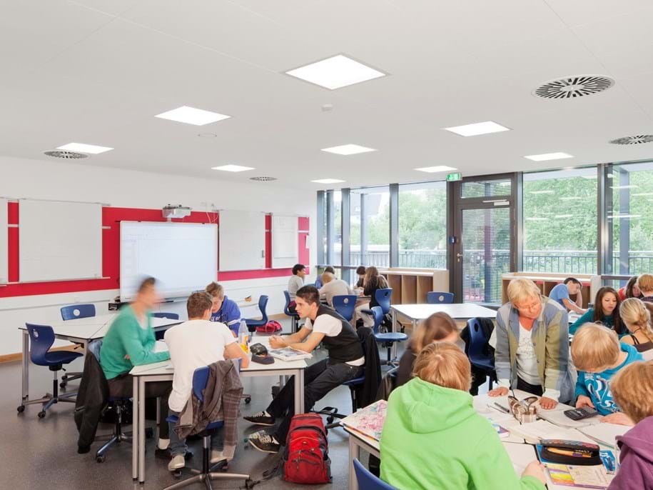 In Klassenzimmern und Aufenthaltsräumen der Oberschule Artland wurden Ecophon Akustikdecken montiert, um die Konzentrationsfähigkeit und Sprachverständlichkeit zu verbessern.
