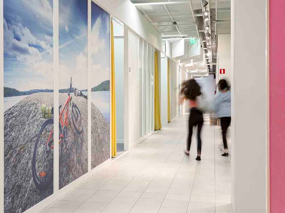 The whole school, complete with chemistry, art and technology classrooms, was built within the shopping centre during the summer. The open retail space was divided into classrooms with 2.7-metre-high Ecophon Akusto™ Wall screen panels. There are now a total of 25 learning spaces across two floors.