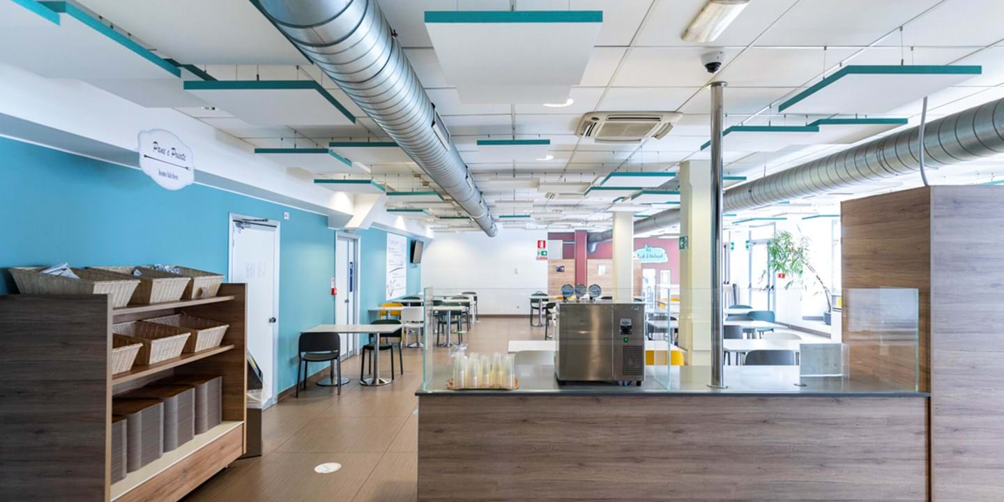 Fußnote: Die Decke der Leonardo-Campus-Kantine wurde mit Ecophon Solo Deckensegeln und Hygiene Akustikdecken saniert.