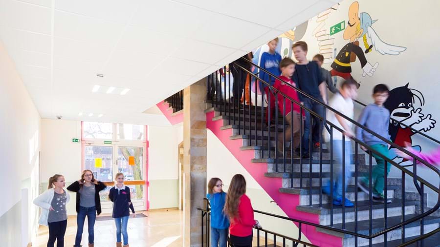 Pausenhallen, Treppenhäuser, Mensen: Starkfrequentierte Bereiche wie diese gilt es, akustisch wirksam von Klassen- und Lehrerzimmern abzugrenzen. Darüber hinaus sollen sie selbst eine hohe Aufenthaltsqualität garantieren, da sie als Orte der Entspannung und Erholung wichtiger Bestandteil der modernen Pädagogik sind. Die Kombination Decke und Wand ist deshalb auch hier maßgebend, um die Zielwerte der DIN18041 und ASR A3.7 zu erreichen. Für Pausenhallen und Treppenhäuser empfehlen sich robuste Akustikmaterialen, in Mensen und Speiseräumen sollte ein besonderer Fokus auf der Hygiene und Reinigungsfähigkeit liegen.
