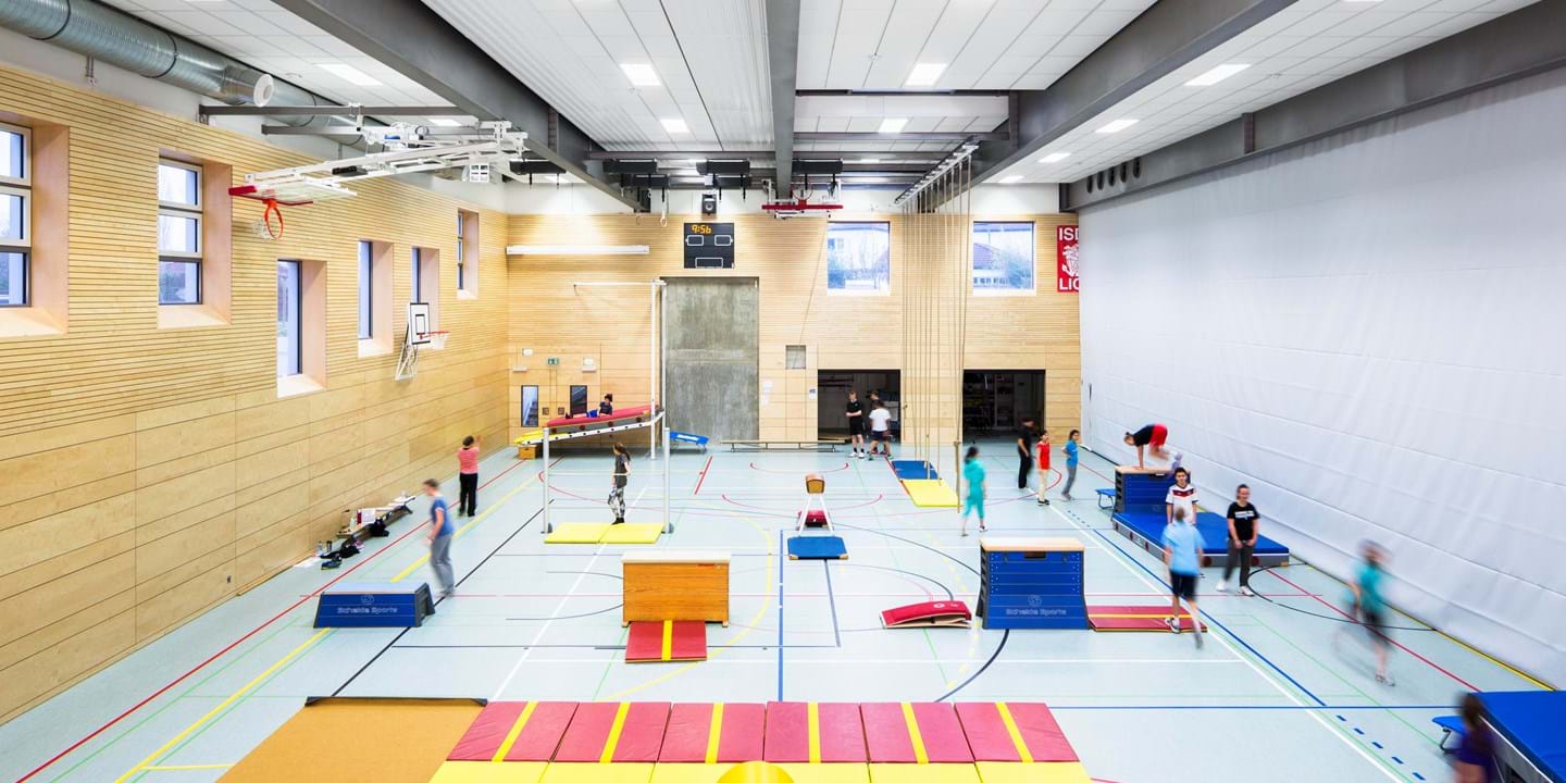 Eine vollflächige, höchstabsorbierende und ballwurfsichere Deckenfläche unterstützt den Sportunterricht optimal. Foto für Ecophon: HG Esch Photography