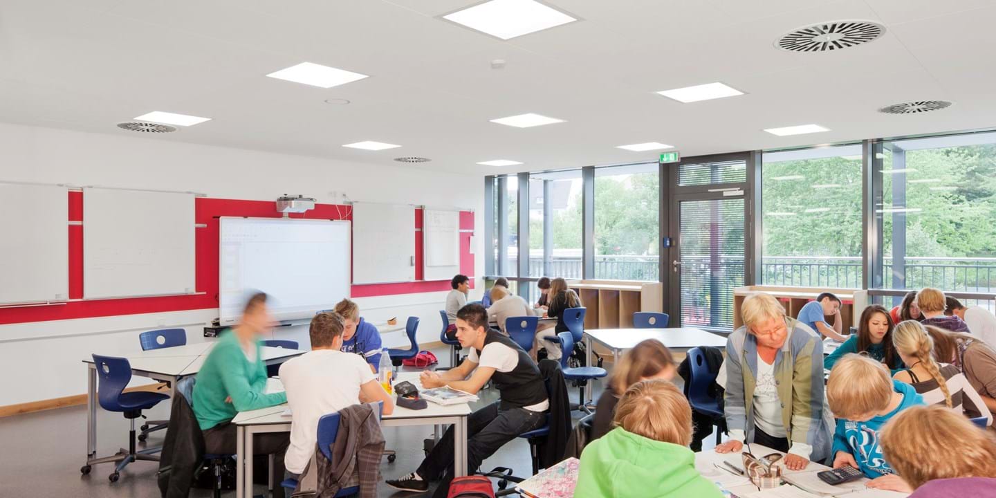 In Klassenzimmern und Aufenthaltsräumen der Oberschule Artland wurden Ecophon Akustikdecken montiert, um die Konzentrationsfähigkeit und Sprachverständlichkeit zu verbessern. Foto für Ecophon: Christian Wese