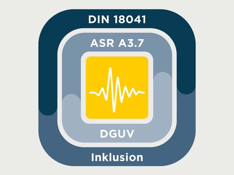Unsere Akustik-Garantie berücksichtigt die DIN18041:2016-03, DGUV Regel 102-601 „Branche Schule“, ASR A3.7 Lärm und Inklusion.