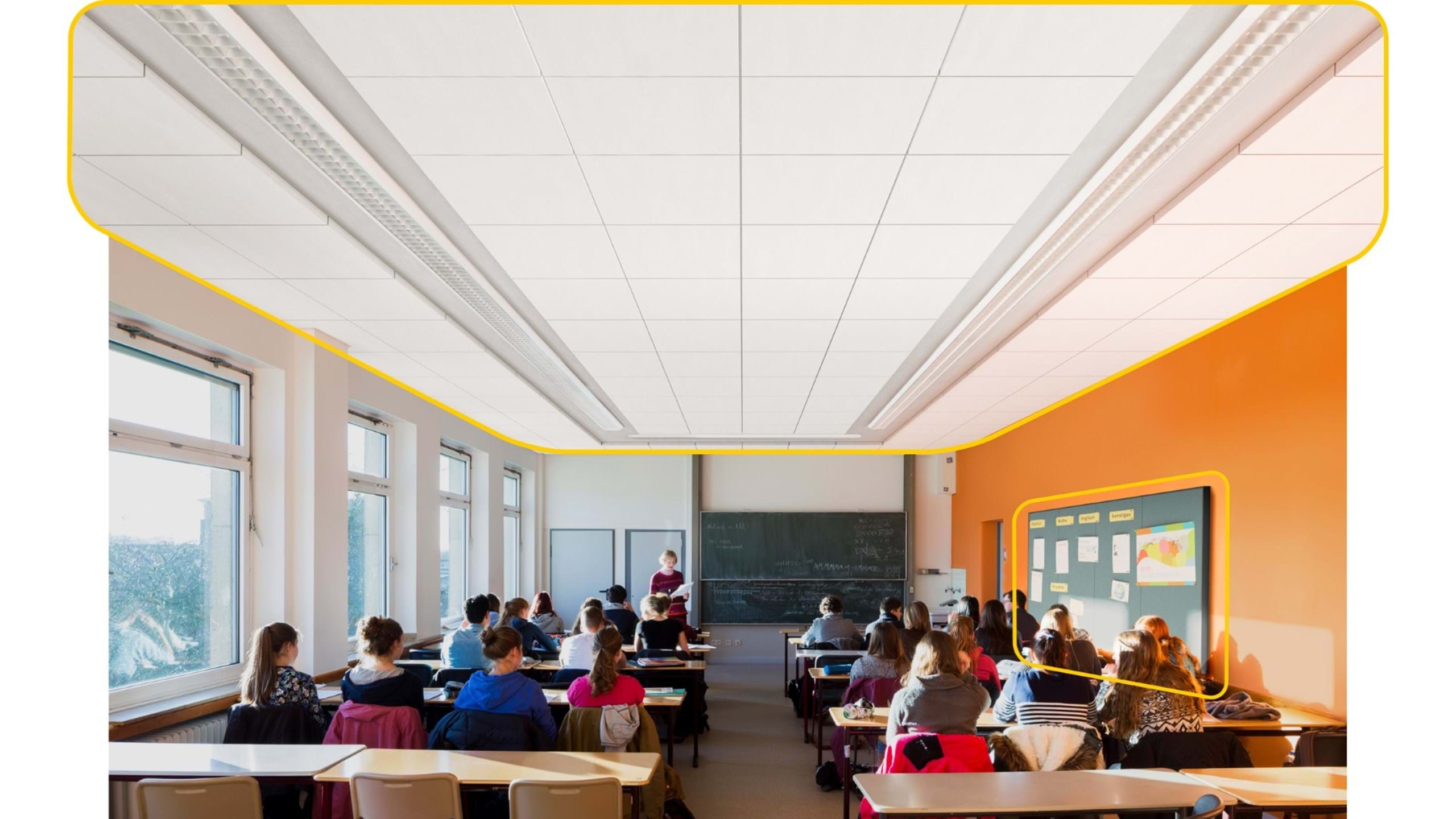 Das Klassenzimmerpaket Sanierung enthält als akustische Grundversorgung die höchstabsorbierende Akustikdecke Ecophon Master SQ, deren Platten ganz einfach direkt auf die Rohdecke geklebt werden können. Besonders geeignet ist dieses System für niedrige Raumhöhen oder überall dort, wo Installationen, wie z.B. Licht, nicht verändert werden sollen.