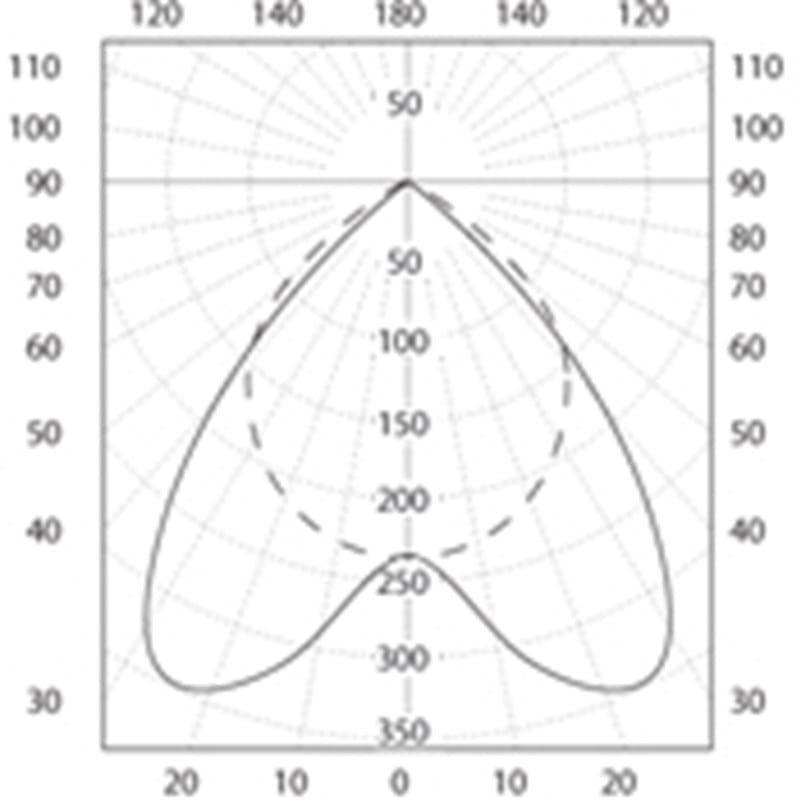 La curva de distribución luminosa es un trazado sobre un diagrama polar. Indica la intensidad luminosa de la luminaria en cd/klm en diferentes direcciones en función del ángulo de visión en uno o más planos. Una línea continua muestra la distribución de la luz perpendicular al eje longitudinal de la lámpara, y la línea discontinua muestra la distribución de la luz en la dirección longitudinal. La dirección hacia arriba y hacia abajo muestra la salida de luz directa o indirecta de la luminaria. Los datos de salida de luz también se pueden usar para la planificación de luz en un software (por ejemplo, Dialux).