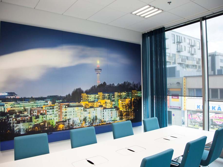 Näyttävät akustiikkataulut tuovat väriä toimistoihin ja neuvotteluhuoneisiin. A-Insinöörien tiloissa akustiikkataulut on päällystetty valokuvakankailla.
