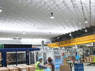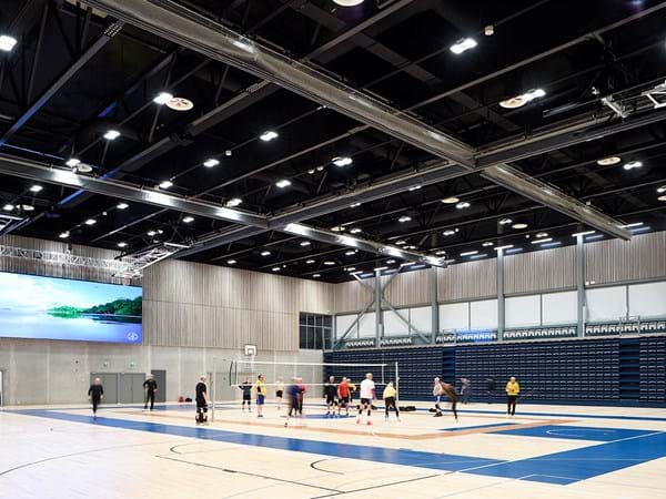 Ouluhallin keväällä 2021 valmistuneen laajennusosan julkisivujen tumma ilme jatkuu sisätiloissa, joissa hyvästä ääniympäristöstä huolehtivat mustat Ecophon Industry -sarjan tuotteet.