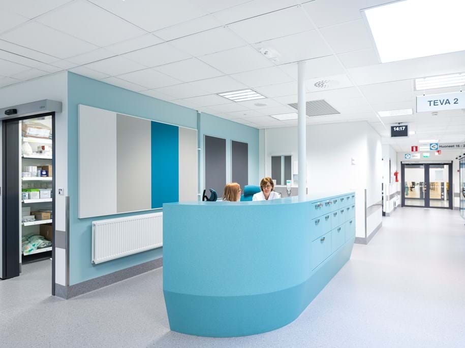 A particular requirement of hospital facilities is that all surfaces, from floor to ceiling, are hygienic and cleanable, meaning that standard acoustic solutions cannot be used. In the Seinäjoki unit, the walls are decorated with nature-themed, printed acoustic panels. In addition to absorbing sound, these also make the corridors and treatment rooms more visually appealing.