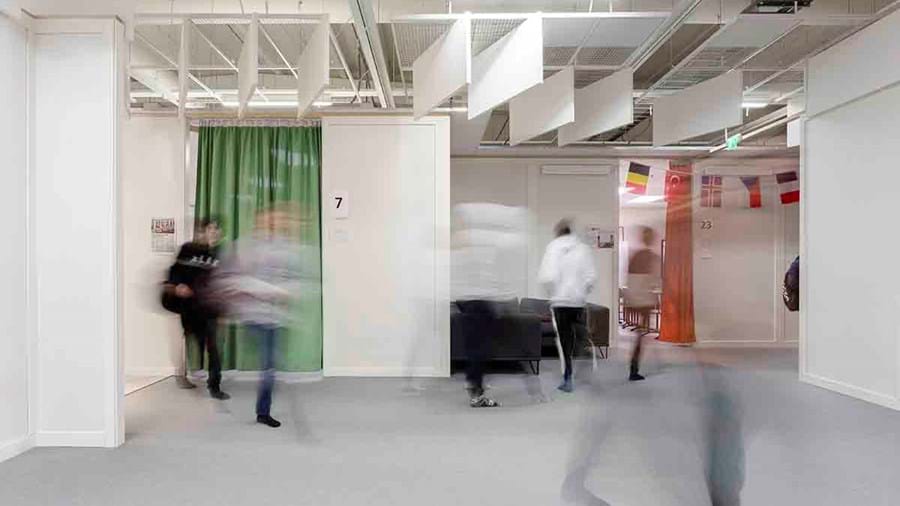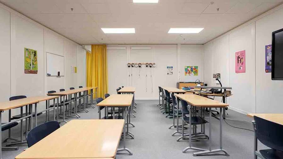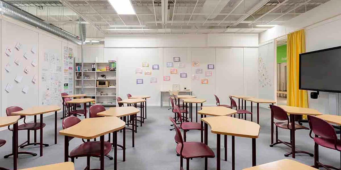 The whole school, complete with chemistry, art and technology classrooms, was built within the shopping centre during the summer. The open retail space was divided into classrooms with 2.7-metre-high Ecophon Akusto™ Wall screen panels. There are now a total of 25 learning spaces across two floors.