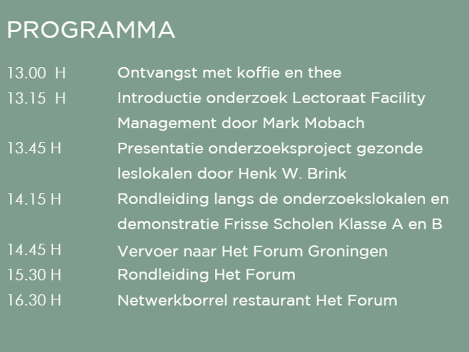 Lector Facility Management Dr. Mark Mobach zal een introductie verzorgen waarin praktijkgericht onderzoek centraal staat. Dr. Henk Brink presenteert zijn onderzoek naar gezonde leslokalen, gevolgd door een rondleiding langs de onderzoekslokalen van de Hanze, ingericht volgens het Frisse Scholen concept (klasse A en B).